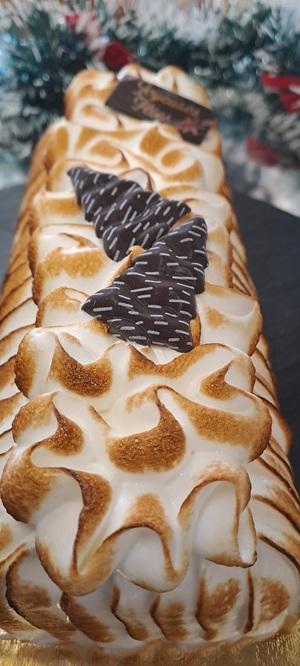 Omelette norvégienne rhum raisins composée d'une glace au rhum avec des raisins macérés dans le rhum, le tout enveloppé d'une meringue à l'italienne, et posé sur une génoise imbibée avec un sirop au rhum