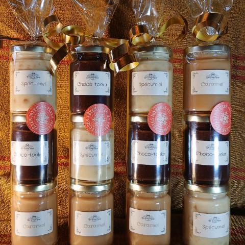 Chaque étui contient 1 Caramiel (120g) + 1 Choco-Tonka (120g) + 1 Spécumiel (110g) ou 1 Marron-miel (115g)