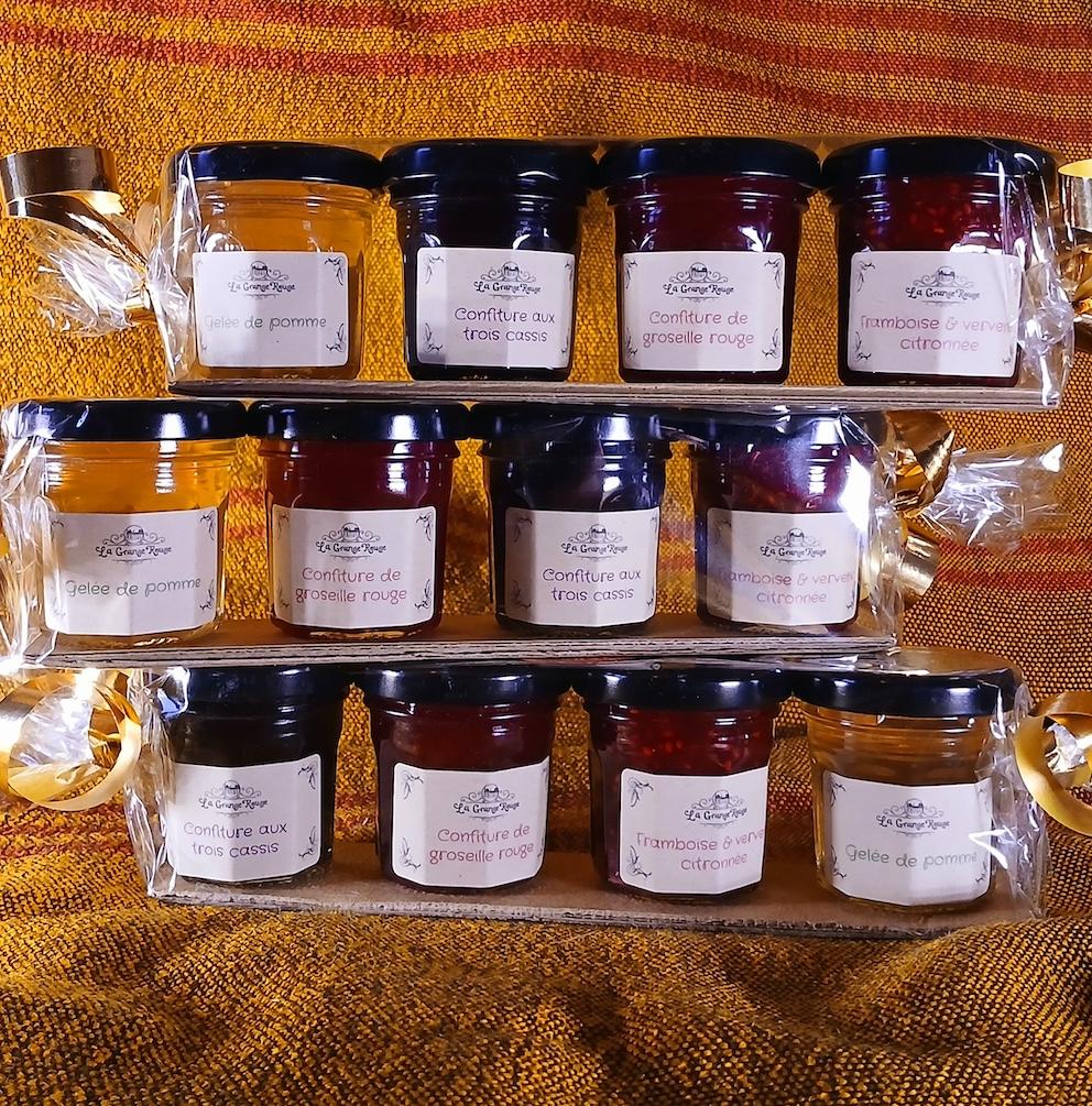 À mettre sous le sapin : une jolie papillote composée de 4 petits pots de confitures individuels, idéal pour une découverte de saveurs originales ou un petit déjeuner à deux. Une pastille "Joyeuses fêtes" est apposée sur le dessus de la papillote. La composition est aléatoire : framboise, cassis, groseilles rouges ou roses, gelée de pomme ou de café… C'est la surprise !
