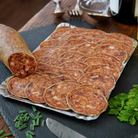 Notre saucisse sèche est fabriquée avec une recette local et uniquement avec les produits de nos porcs, sans conservateur.
