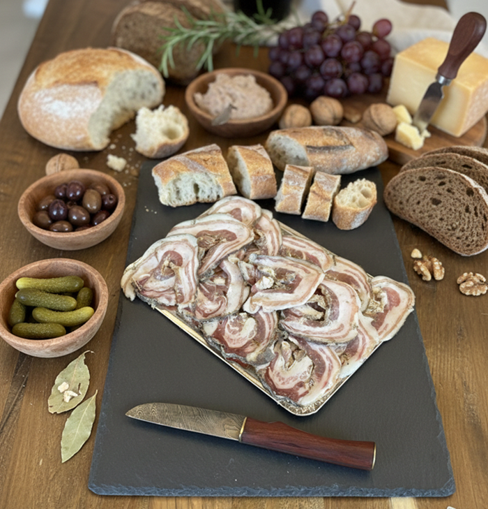 Notre ventrèche est fabriqué avec une recette maison et uniquement avec les produits de nos porcs, sans conservateur. Il est séché dans notre séchoir naturel.